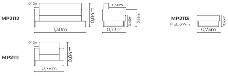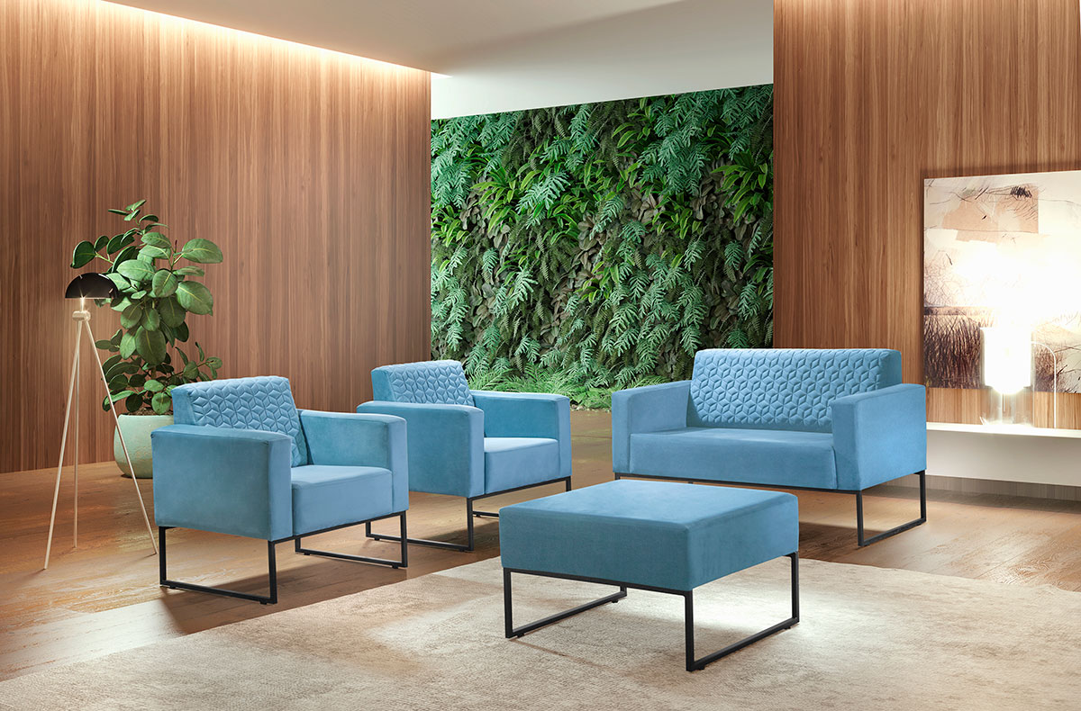 Assento Percinta elástica e espuma D26. Encosto Percinta elástica, espuma D20 soft e revestimento bordado com espuma D20.