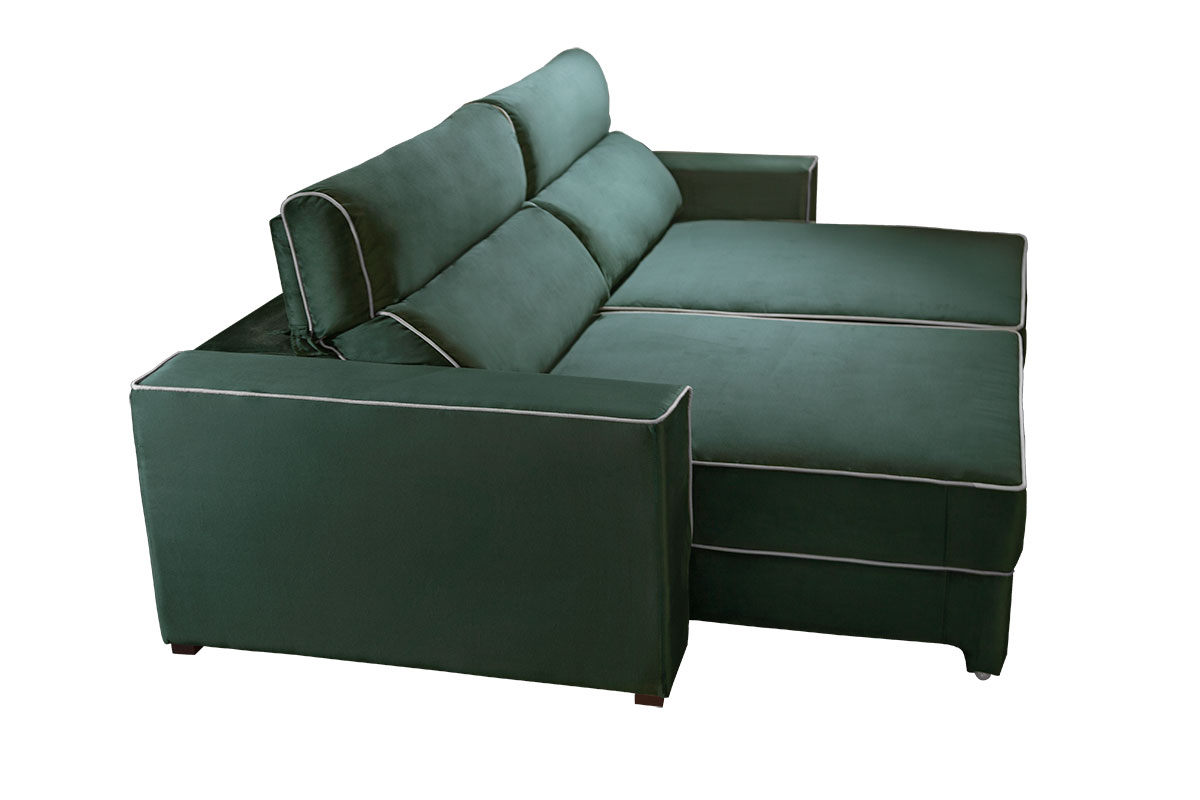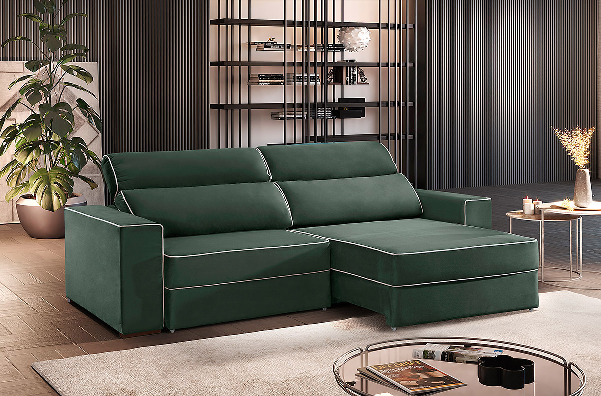 Retrátil com mola espiral, percinta elástica, mola pocket eespuma D28 revestida com manta de poliéster siliconada.