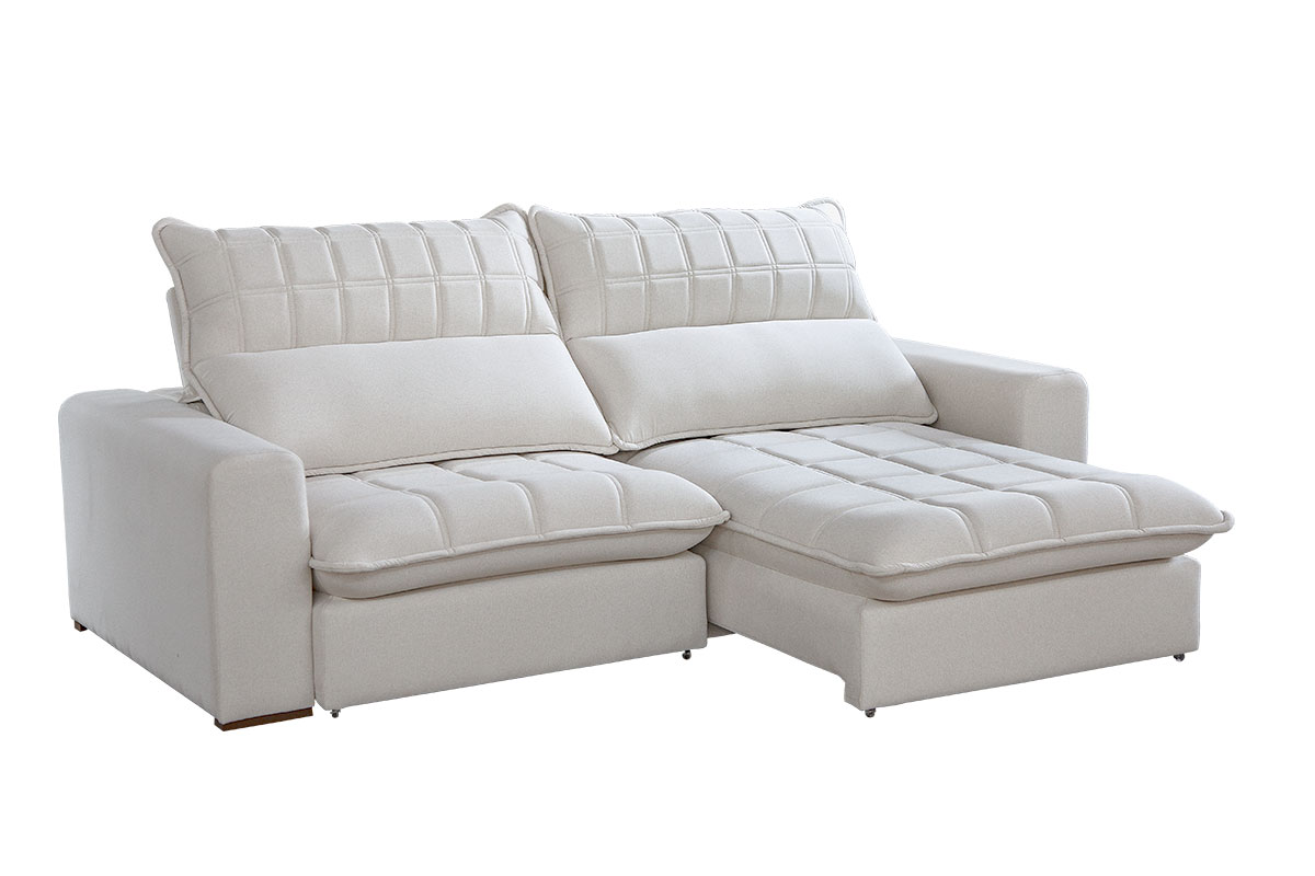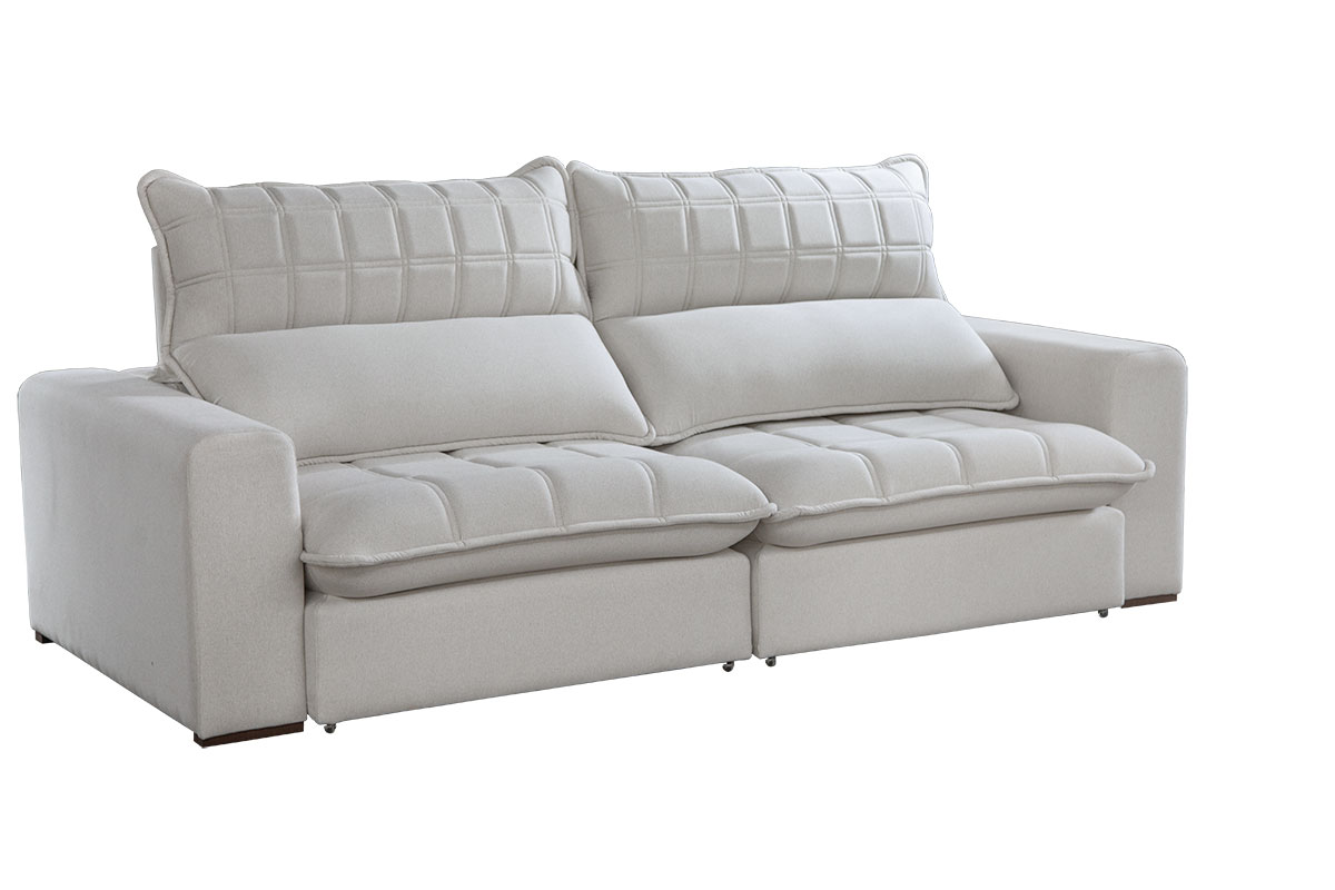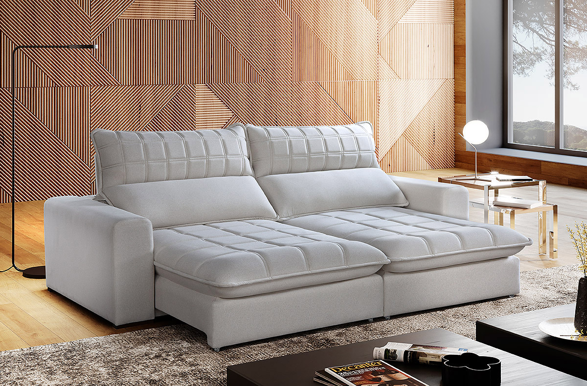 Reclinável e removível com almofadas fixas com fibra de poliéster siliconada e revestimento bordado com espuma D28.