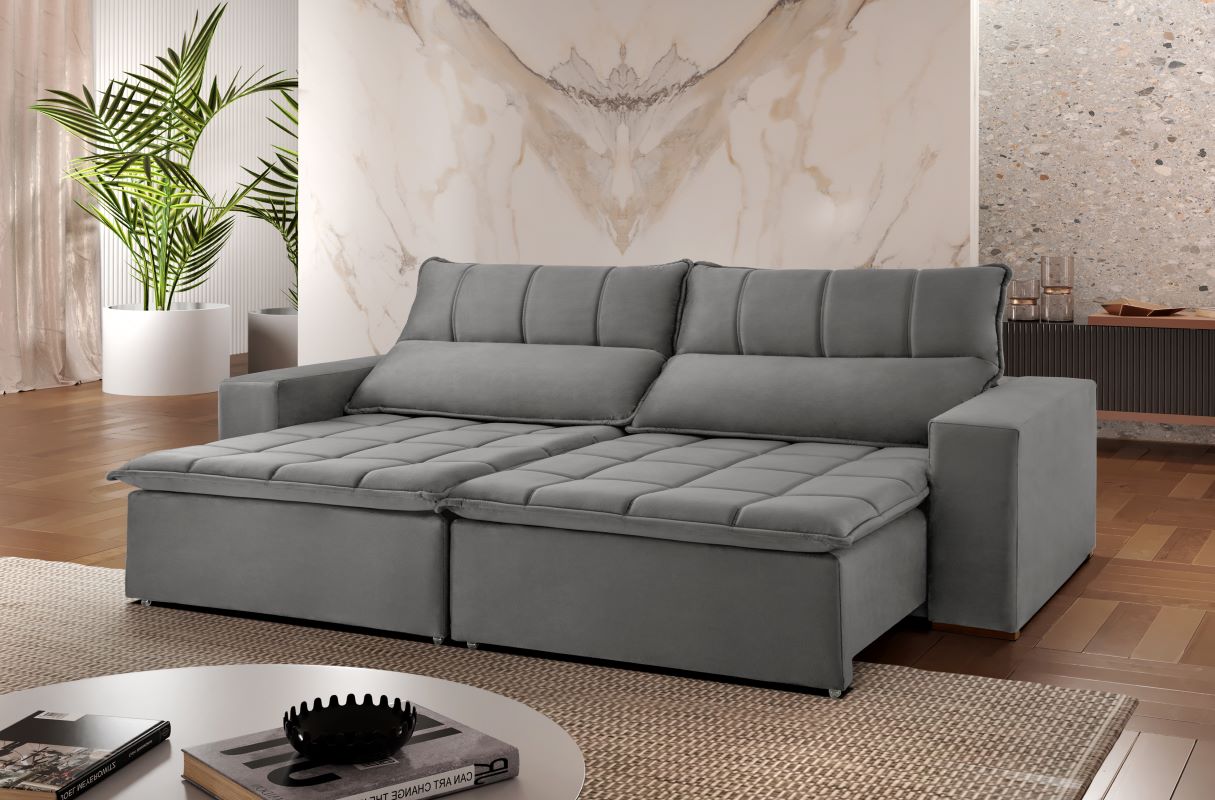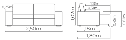 Reclinável e removível com almofadas fixas com fibra de poliéster siliconada e revestimento bordado com espuma D28.